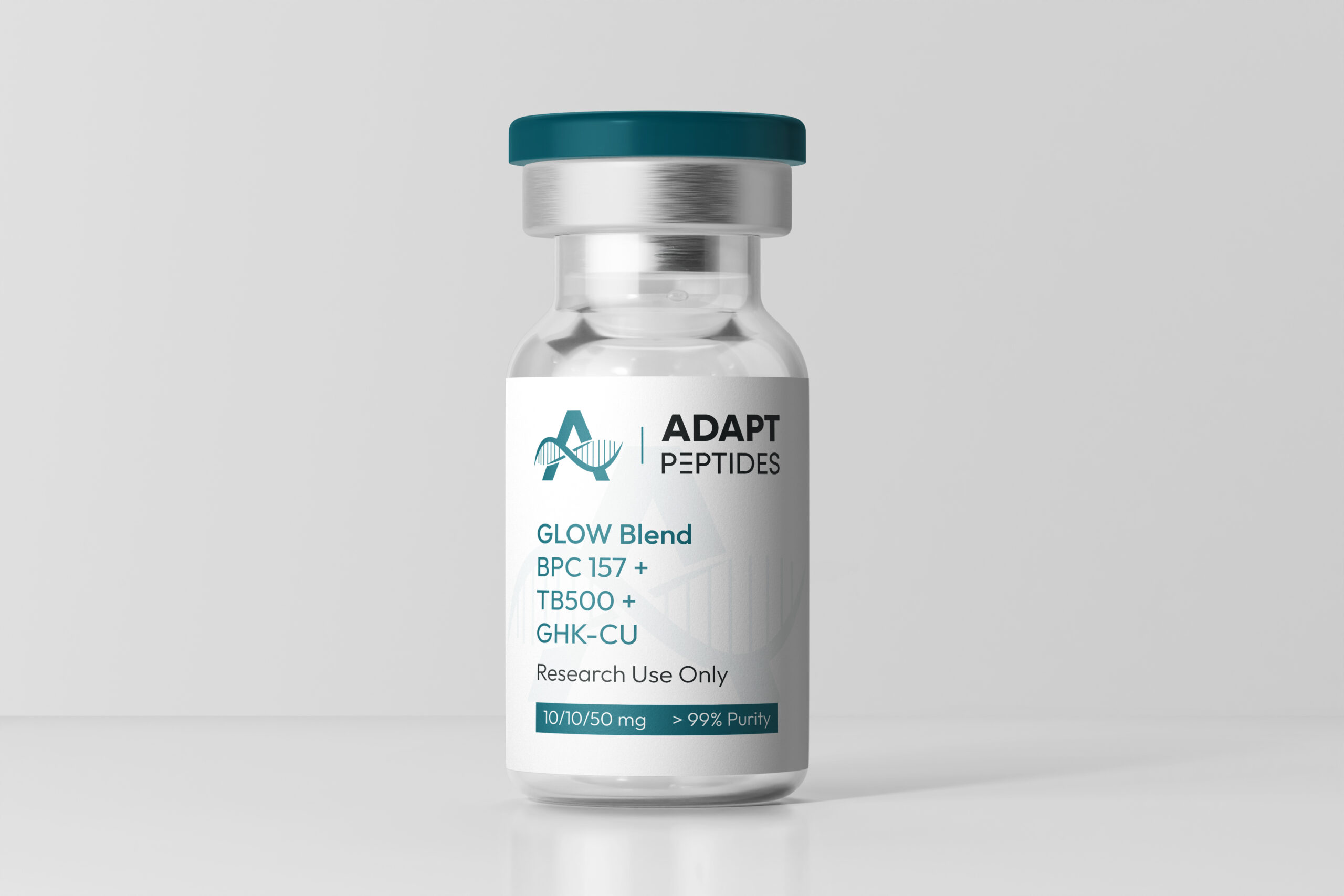 Buy GLOW Peptide Blend from Adapt Peptides. Each 70 mg vial combines GHK-Cu (50 mg), BPC-157 (10 mg), and TB-500 (10 mg) in a carefully balanced ratio to ensure consistency, stability, and research value. Every batch is independently third-party tested for purity exceeding 99% backed by a Certificate of Analysis (COA). All orders are securely packaged and shipped quickly within the United States.